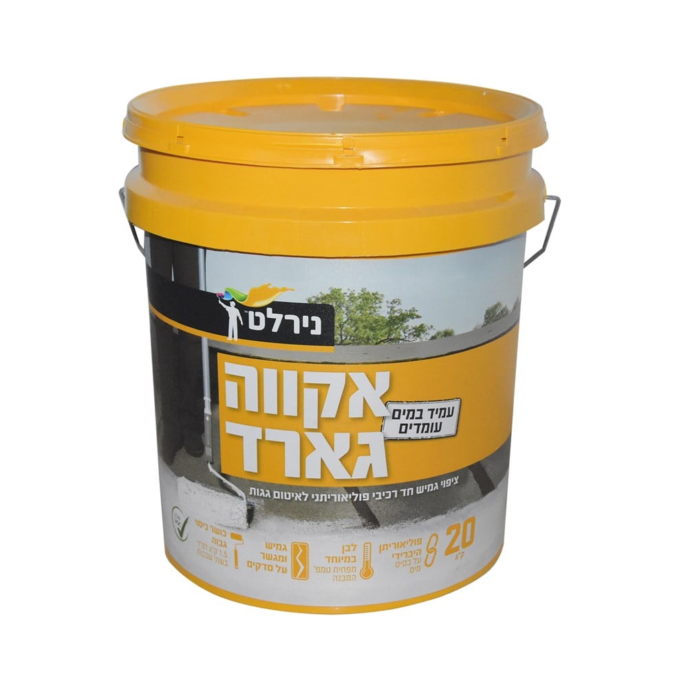 Aqua-Guard is a flexible water-based polyurethane coating preventing the penetration of water through the roof surface in all weather conditions. Intended for sealing of rooms subject to humidity as well balconies (the material is not suitable for application on tiles). Aqua-Guard is highly durable to any weather conditions, UV-radiation and prevents accumulation of dust and dirt. Due to its elasticity, the material covers and prevents the appearance of hairline cracks in the roof surface. After drying creates thick white polyurethane coat resistant to standing water, reflecting the UV-radiation and preventing the building from warming up. Surface Preparation: Prepare the roof thoroughly before application. Remove any unfirmly attached paints and clean from dirt. Rinse the surface while using a highway broom. Use a mortar to scrape bulging and loose areas. After rinsing, make sure that all the water drains away and no areas covered with water remain. Once dry, fill wide cracks with an acrylic sealant such as Niroseal (Silicon). Wait another 24 hours to let the surface completely dry. Aqua-Guard can be applied on bitumen sheets 30 days after it has been applied. Application: In the summer time it is advised to apply early in the morning before the surface heats up. Apply Aqua-Guard in 2 coats with a total weight of 1.5 Kg per m². The first coat serves as a primer and needs to be diluted with 30 % water. The second coat can be applied without dilution. Spread the material by a roller along the surface, use a brush on sides and corners. Wait at least 24 hours before second coat and apply it in the same way. Dilution: dilute the first layer with 30 % water, second with 5-10%. Drying time: To recoat: 24 hours. Full cure: 7 days. Gloss level: Matt. Application temperature: 5 -35 Cº. Colour: White, can be tinted in pastel shades. Recommended Spread Rate*: 1.3 -1.6 Kg/m² * The spread rate is calculated according to the work of a skilled laborer on a surface with an ordinary degree of absorption and may vary according to the working method, surface and weather conditions. Clean-up: Wash hands and tools with water and soap immediately after use.