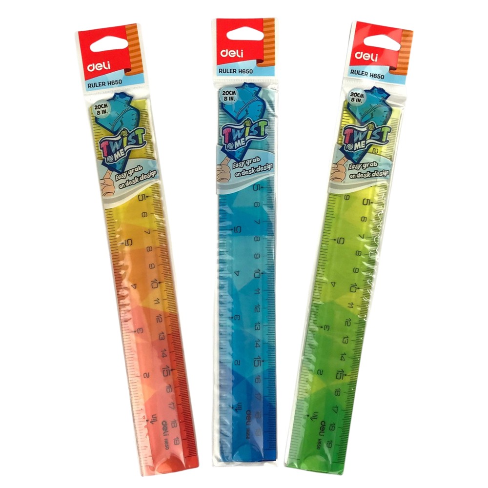 Deli ruler, plastic, mixed colors, 20 cm. Designed for accurate measurement and clear drawing, this ruler is ideal for office and school use.