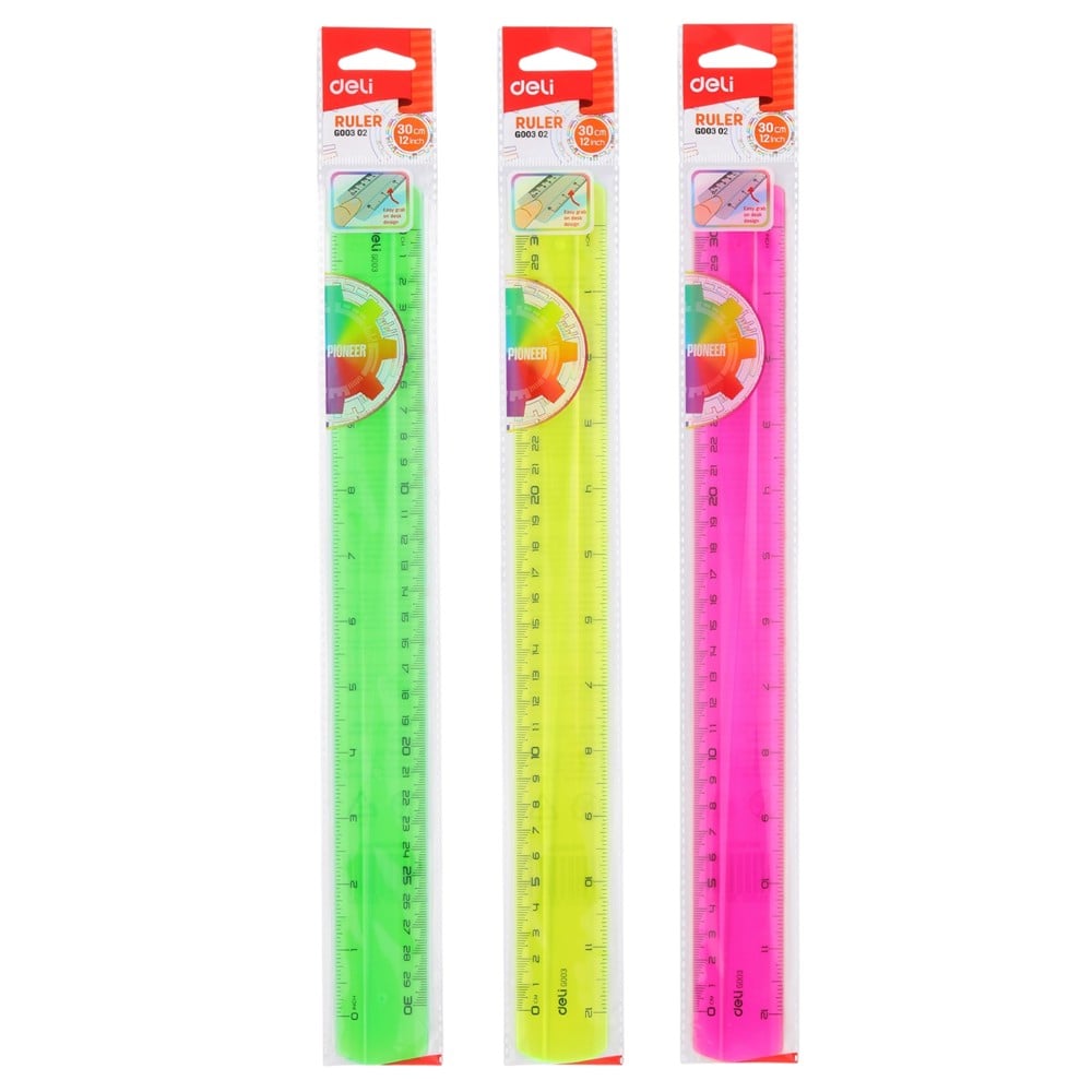 Deli ruler, plastic, mixed colors, 30 cm. Designed for accurate measurement and clear drawing, this ruler is ideal for office and school use.