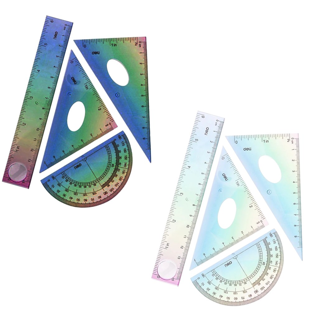 The ideal set for students and professionals who require precision in measuring and drawing. Includes a 15 cm ruler, two geometric triangles (45° and 30°/60°) and a 180° protractor. Made of strong and resistant plastic, with clear graduations in centimeters and inches, this set ensures long-term use and accurate measurements. The gradient color design makes it even more attractive for use at school or at home.