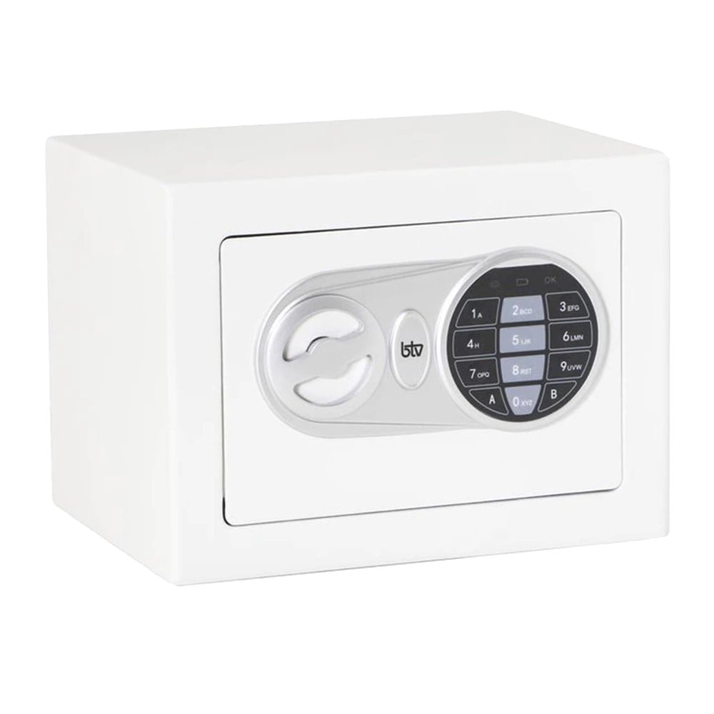 Safe MINI BANK BTV for home and office, safe and elegant, with a door thickness of 6 mm and a body thickness of 1.5 mm. White color, dimensions 200 x 310 x 200mm, opening method with key and electronic.