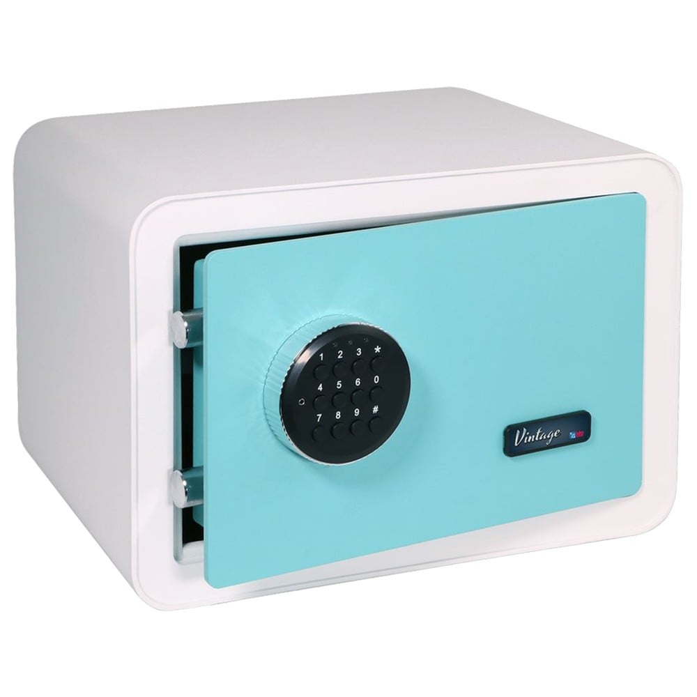 VINTAGE BTV safe for home and office, safe and elegant, with 6mm door thickness and 3mm body thickness. White color, dimensions 250 x 350 x 280mm, key and electronic opening method, an 8-digit emergency code. safe weight 16 kg and internal capacity 17 Lt.