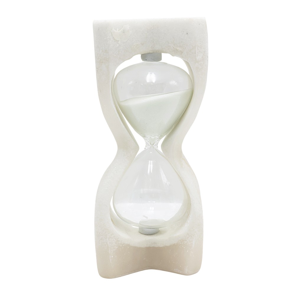 An accessory that combines functionality with aesthetics. This decorative sand timer is made of durable glass and white resin, making it elegant in appearance but also suitable for different furnishing styles, bringing a sense of purity to any space. With dimensions of 10x7xH23 cm, it is ideal for placing on tables, shelves or work environments as a fine decoration and a symbol of the flow of time.