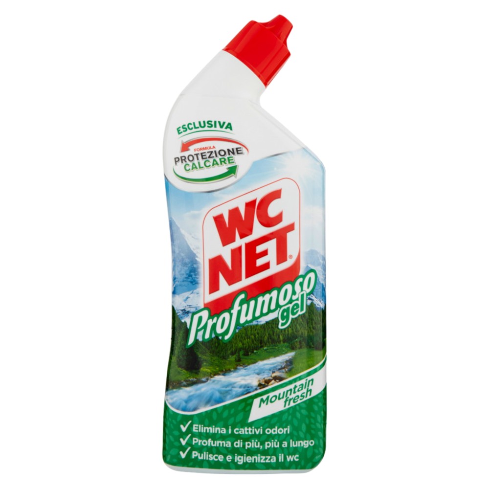 WC Net scented toilet cleaner. Cleans and disinfects the toilet. Exclusive limescale protection formula. Eliminates bad smells. Its gel formula eliminates bad odors from the toilet, ensuring a pleasant and long-lasting clean scent throughout the toilet. Thanks to the active agents and the anti-limescale system, it helps prevent the formation of limescale, protecting your toilet.