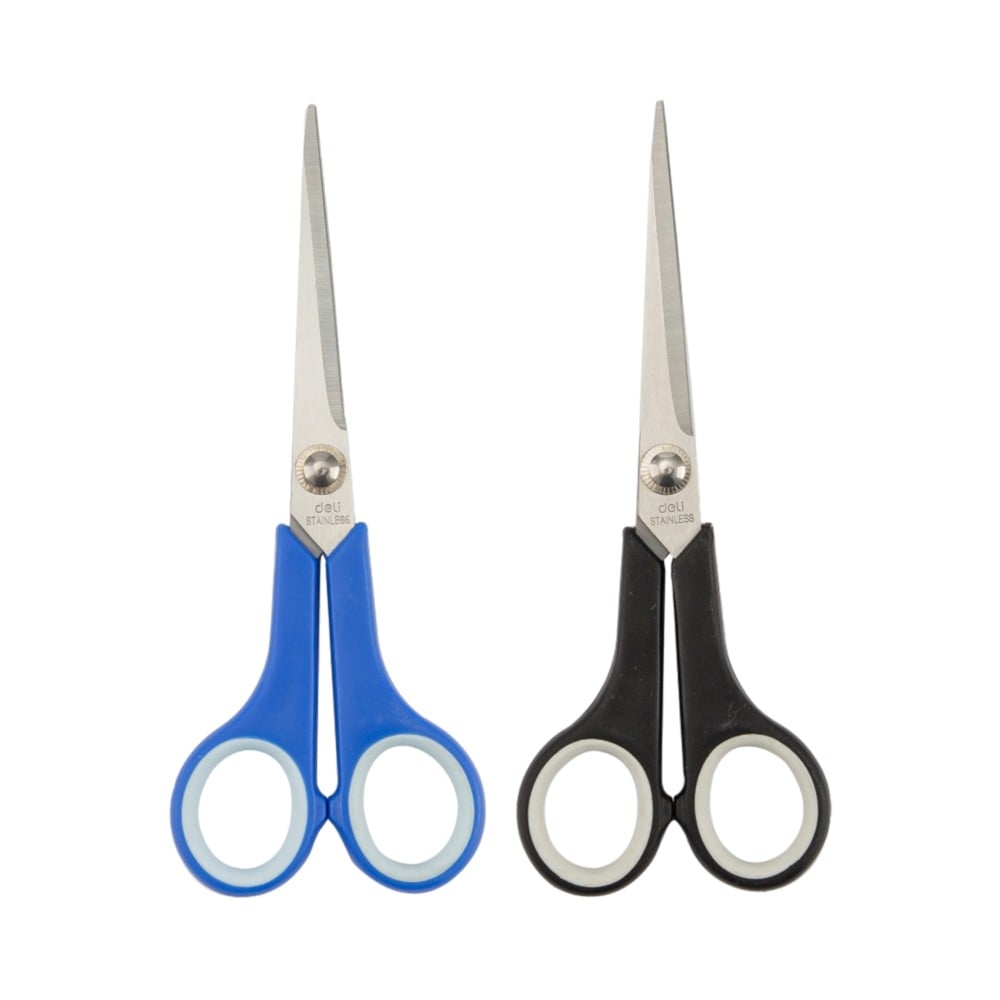 Deli scissors 17.5 cm made of plastic handle and stainless steel base. Suitable for paper cutting.