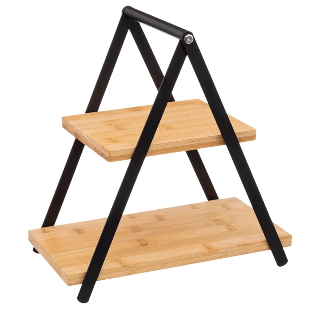 Serving accessory with 3 serving positions with modern design. It is made of bamboo in a natural shade with a black metal frame. Can be used as a serving tray - hors d'oeuvre for the dining room, coffee table or sideboard.