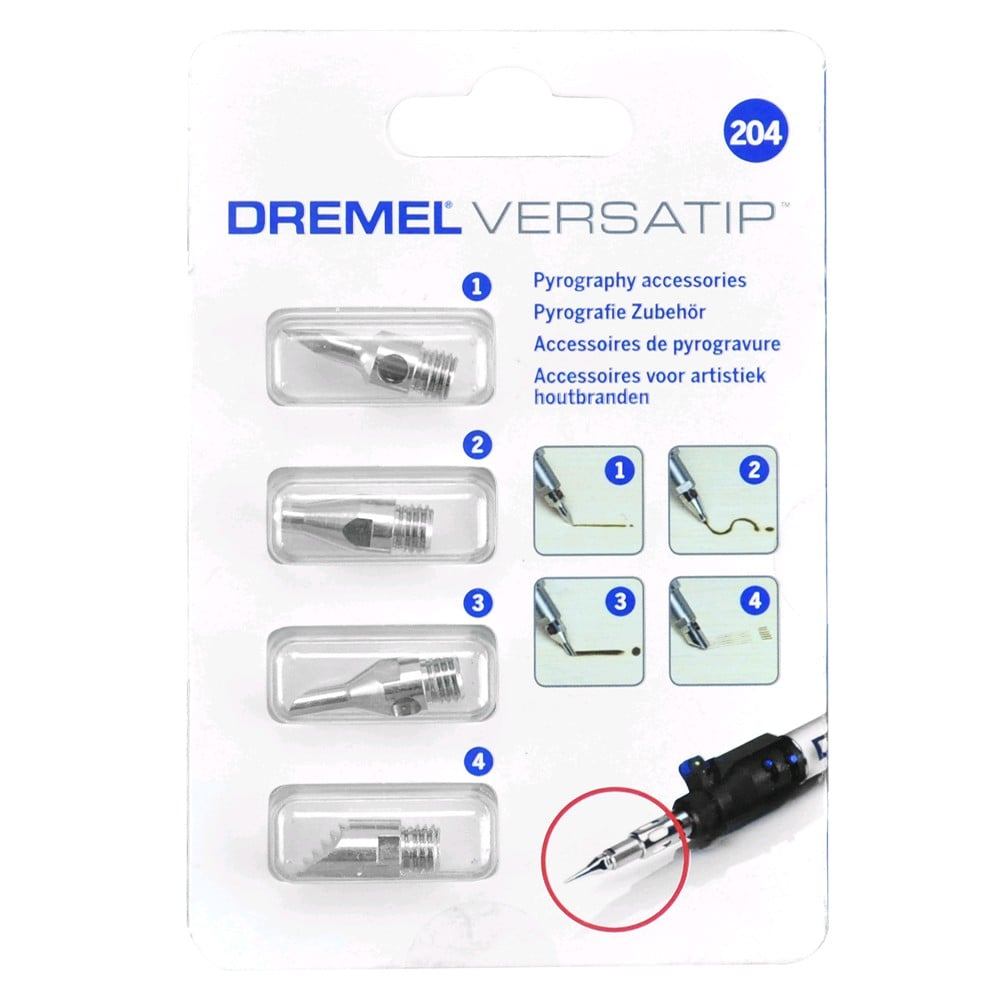 These new Dremel pyrography accessories are used to apply different pyrography motifs onto wood and leather. The set includes four tips with different shapes: ball point, oval, sharp point and pattern. Applications include drawing, shading, striping, patterning.