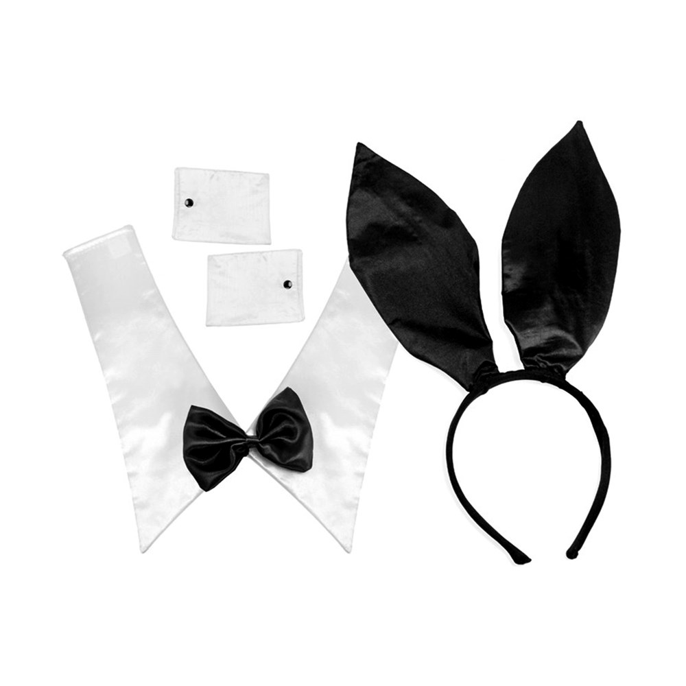 This bunny set consist the set contains a headband with ears, a collar with a bow tie and cuffs -black tie. The bunny tail is simply attached to the fixed pin to cloth. Uses: diferent party, halloween, etc.