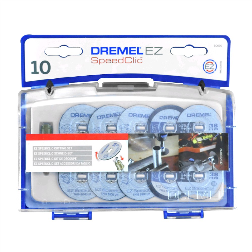 Assortment of 10 SpeedClic cutting wheels and the special SpeedClic mandrel. 6 Regular 38mm metal cutting wheels. 2 Special thin cutting wheels.2 Unique plastic cutting wheels.