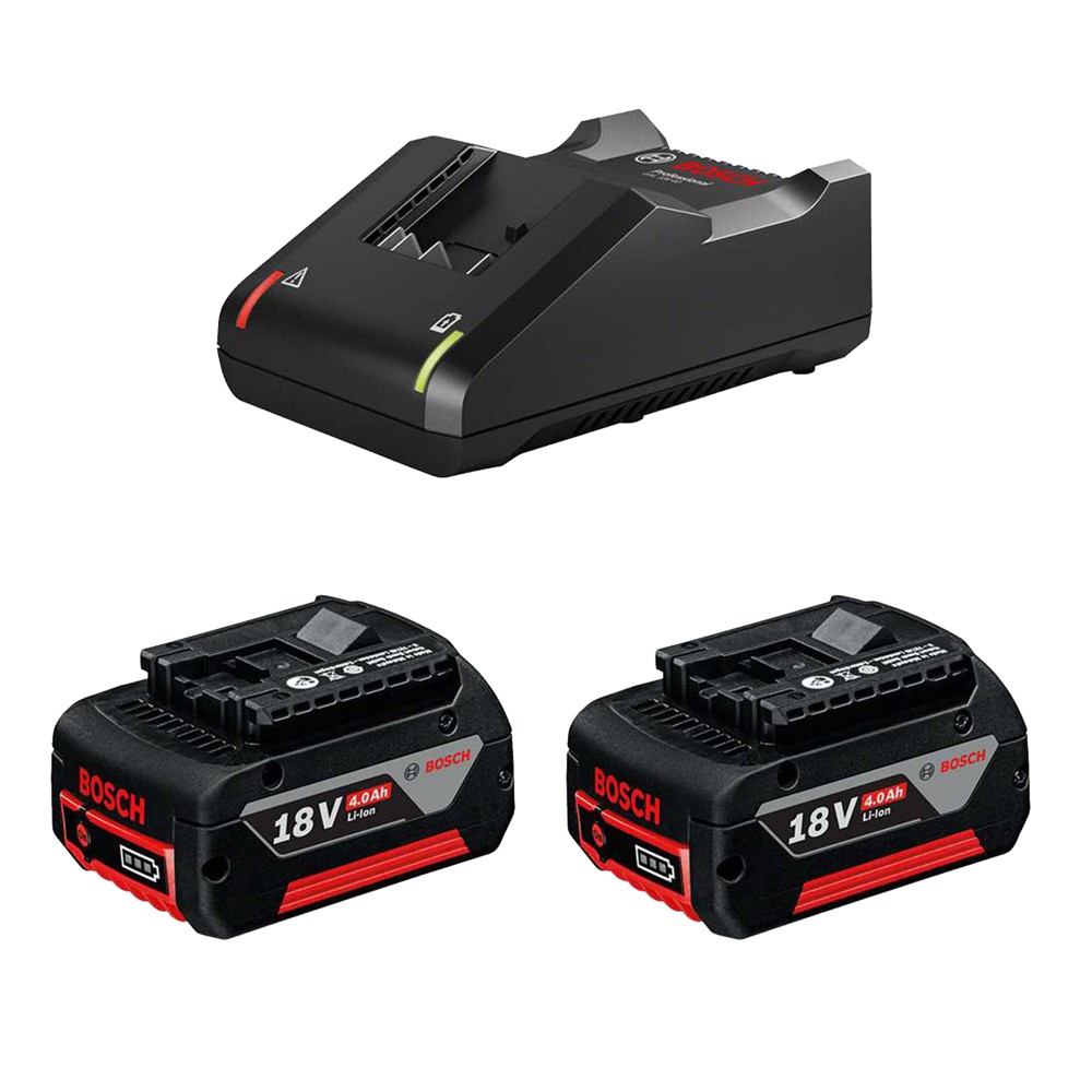 The GAL 18V-40 offers a modern design and is extremely compact. With a charging current of 4 A, it charges a GBA 18V 4.0Ah battery up to 80% in just 48 minutes and a GBA 18V 2.0Ah battery up to 80% in 24 minutes. This compact charger is part of the Bosch Professional 18V system and is fully compatible with all Bosch Professional 18V batteries The GAL 18V-40 can also be mounted on the wall.The GBA 18V 4.0Ah Professional 18-volt battery from Bosch has been designed for extended runtime. Thanks to its higher battery capacity it enables a runtime of 100% longer than the model 18V 2.0Ah. For better heat dissipation at the battery from the inside to the outside this model is also available via COOLPACK 1.0 technology. Because heat can damage the cells, the COOLPACK technology ensures a longer battery life and allows longer operating times. The GBA 18V 4.0Ah Professional is a lithium-ion battery with a battery charge gauge.