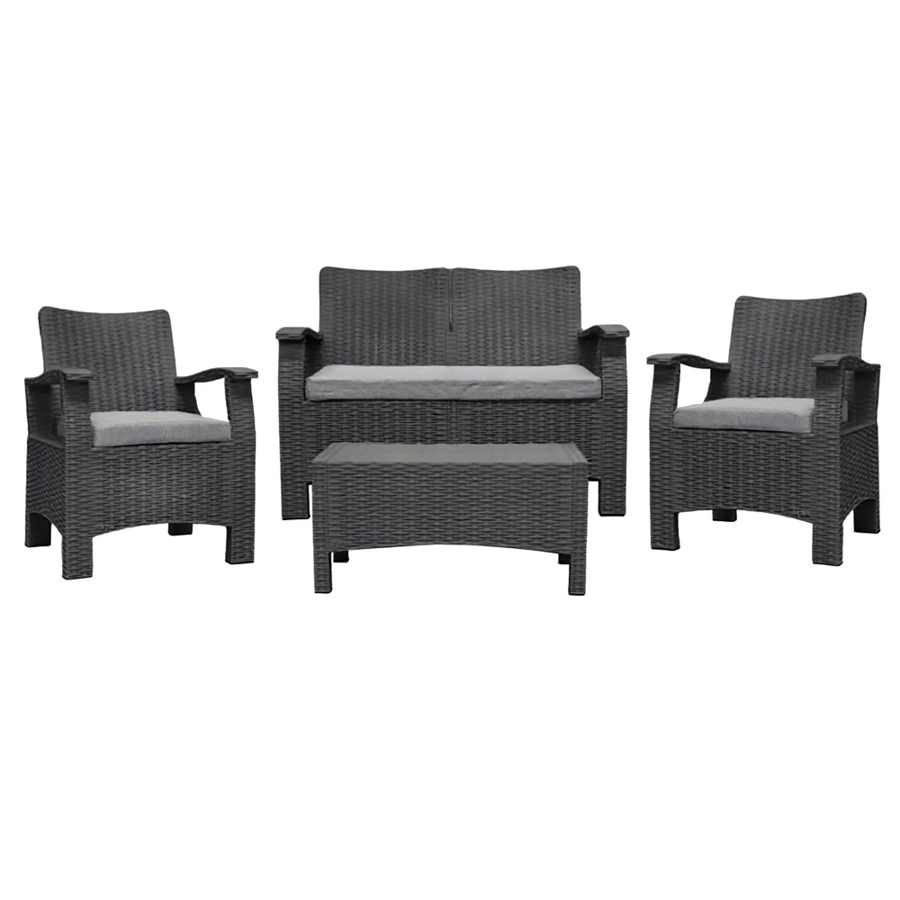 You're reviewing:Set of 2 single armchairs with cushions + 1 double armchair with cushions + 1 coffee table, plastic rattan, anthracite structure, grey cushions, single 56x64xH89 cm / double 56x118xH89 cm / table 48x85xH42 cm