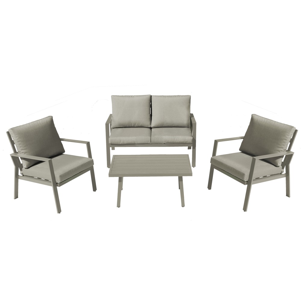 Modern minimalist beige set. Plenty of room for 4 people and very comfortable and relaxing. Thanks to the center table, this set is suitable for enjoying tea, coffee or your favorite drink on balconies, verandas or green gardens. Quality aluminum materials make this set practical, as well as suitable for uses near the coast, since aluminum has anti-corrosive properties.