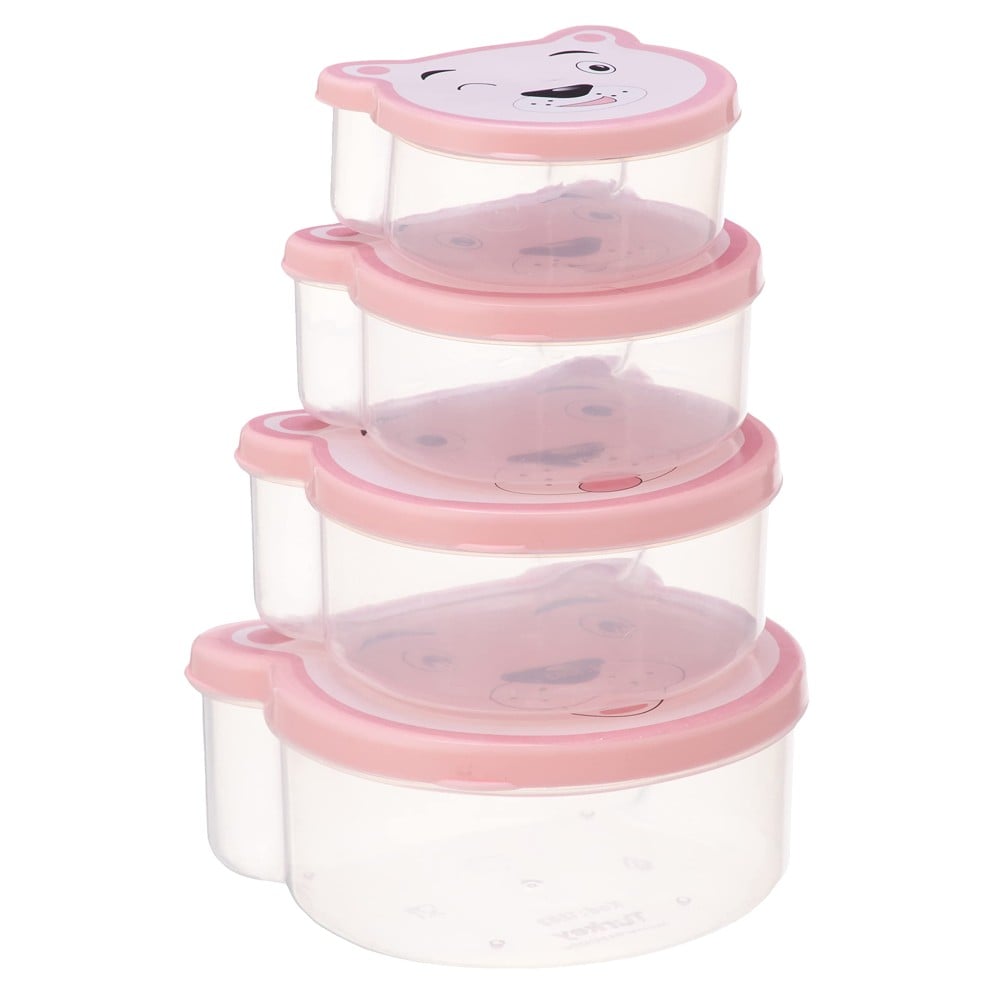 The bowl of the children's bowl, included in a pack of 4 bowls, is made up of plastic and is transparent. This set includes bowls with different lids with the following capacities:
