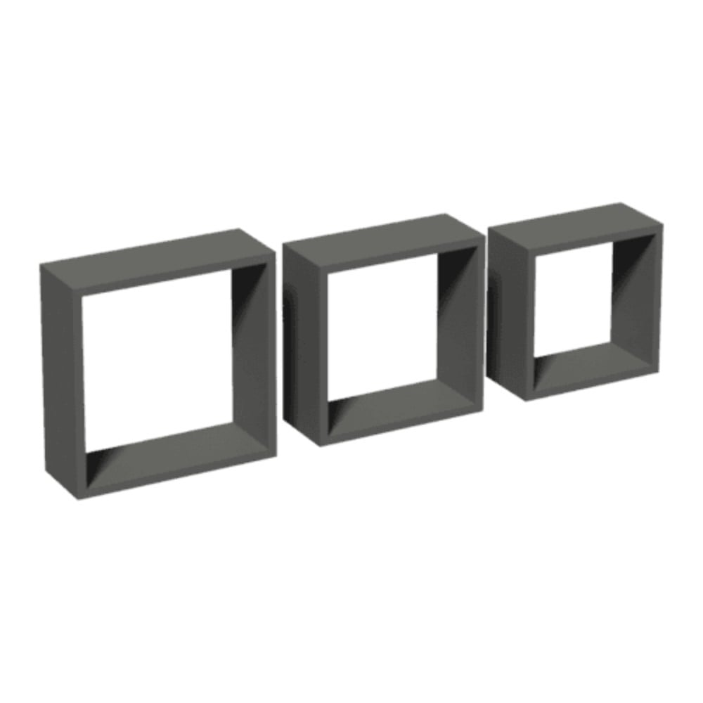 Square-shaped modular floating shelves, made of melamine material, The shelves are simple and quick to assemble and mount on walls, and thanks to the hidden fastening system, the brackets cannot be seen, there are no need for plugs to hide bolts or screws and the installation does not require the use of profiles. This set is suitable for use in indoor environments such are living rooms, bedrooms, offices, studios, etc.