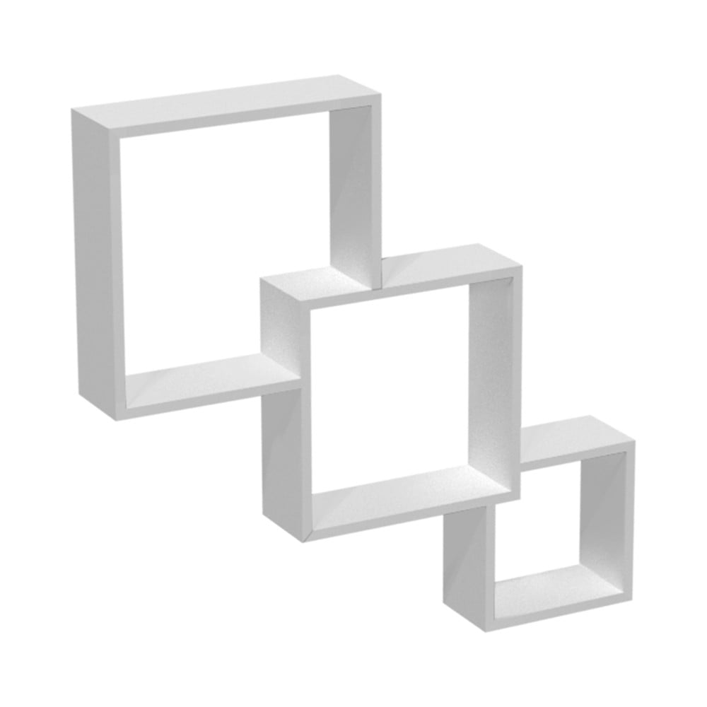Square-shaped modular floating shelves, made of melamine material, with dimensions of 15x32x32 cm, 15x28x28 cm and 15x20x20 cm, in white color. The shelves are simple and quick to assemble and mount on walls, and thanks to the hidden fastening system, the brackets cannot be seen, there are no need for plugs to hide bolts or screws and the installation does not require the use of profiles. This set is suitable for use in indoor environments such are living rooms, bedrooms, offices, studios, etc.