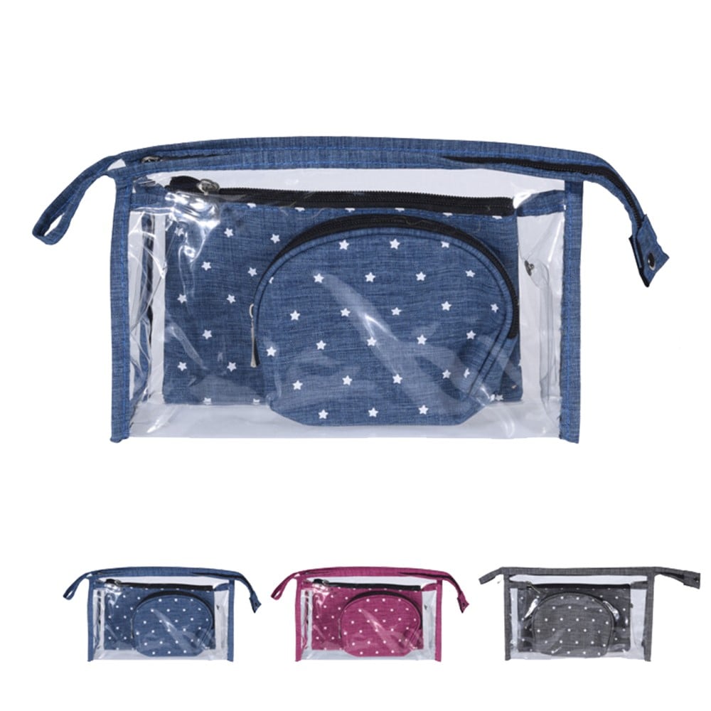 Set of cosmetic bags, which contains a transparent cosmetic bag, made of polyvinyl material, with dimensions of 24.5x16x7.5 cm, and 2 small cosmetic bags, made of polyester material, equipped with zippers, with dimensions of 19.5x13 cm and 14x11.5 cm, in different colors. The set is used for storing and carrying various cosmetic products and personal hygiene products, such as creams, shampoos, makeup products, perfumes, various lotions or other accessories, as well as for organizing them in travel bags. This product is lightweight and has compact dimensions, which make it convenient to take with you on trips.