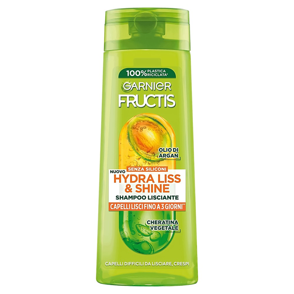 Fructis Shampoo Hydra Liss & Shine, straightening shampoo, ideal for difficult to straighten and frizzy hair. Our formula enriched with argan oil, softens and gives intense shine to the hair. Furthermore, our technology enriched with vegetable keratin coats the hair fiber to smooth hair with an anti-frizz effect.
