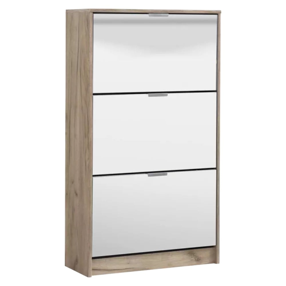 The Hugo shoe rack, in a combination of mirror and part of the structure in gray oak, has three segments for storing shoes and thanks to its dimensions and two-row organization, it is a very effective functional solution for the decoration of a modest size of the corridor.