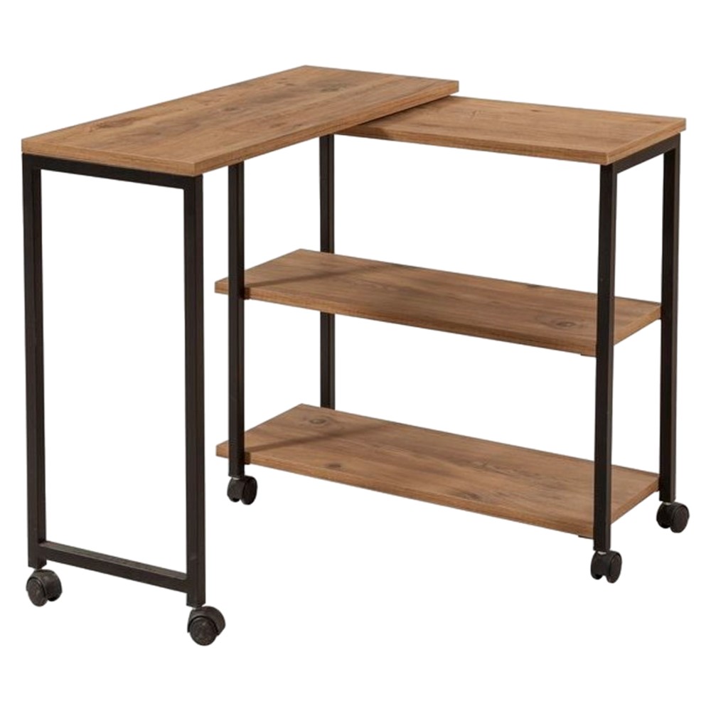 Side table, with metal support structure and surface area made of melamine, in black and brown colors. The table is equipped with 3 compartments for placing magazines or various decorative objects, as well as has an upper surface which rotates and opens to enable the placement of a laptop or books, creating a functional space for working or studying. The supporting structure has wheels with 360° mobility, which allow the table to be easily moved to the desired space. The minimalistic design makes this table suitable for rooms decorated in a contemporary or even traditional style.