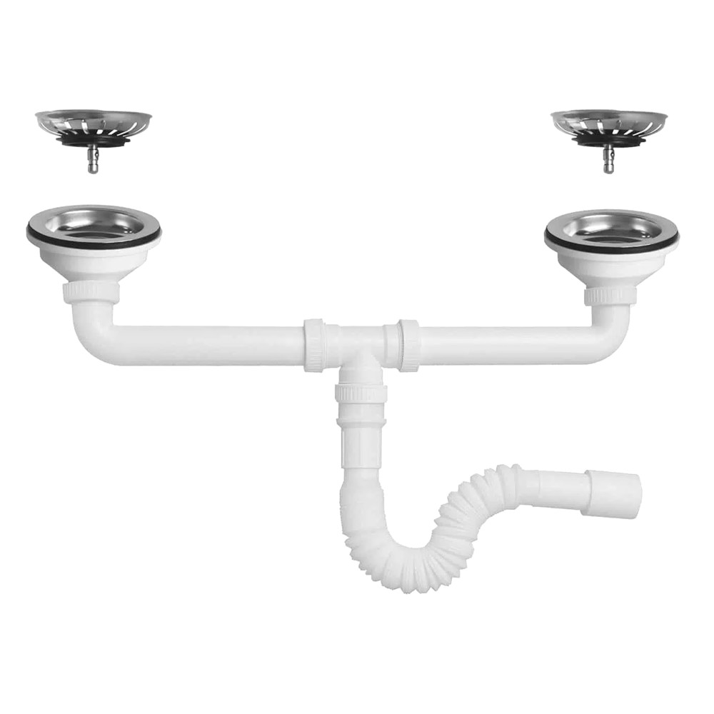 This sink siphon set with two outlets, the drain Complete with pipes is a main element for draining water. The component material of the siphon is PP (polypropylene) which offers high resistance to chemicals and excellent insulating properties. The size of the connection to the pipe is 1x1/2"' with a discharge diameter of 32-40 mm.
