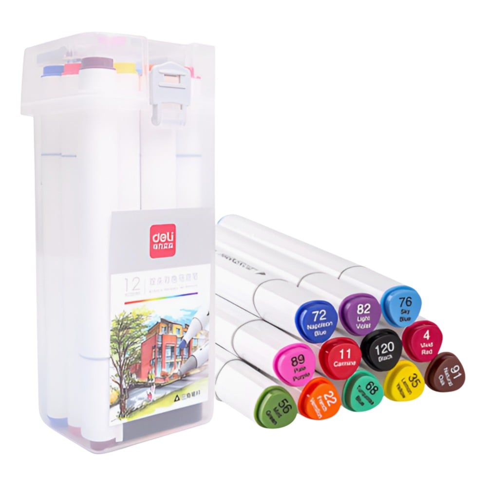 This set of 12 Sketch Markers from Deli has two tips: a fine tip for precise details and a coarse tip for fast coloring and uniform coverage. The vibrant and long-lasting colors make this set ideal for drawings, illustrations and creative projects. Suitable for students, young artists and art enthusiasts, with safe and resistant materials for long-term use.