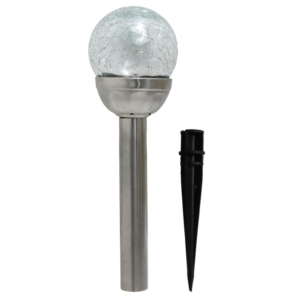 Solar panel light, measuring 8 x 34 cm, and glass globe. This light is equipped with a 600mAh battery and uses solar energy to provide lighting at night. The glass globe design gives it an elegant and modern look, making it ideal for use in the garden, veranda, or outdoor areas, creating a warm and pleasant atmosphere.