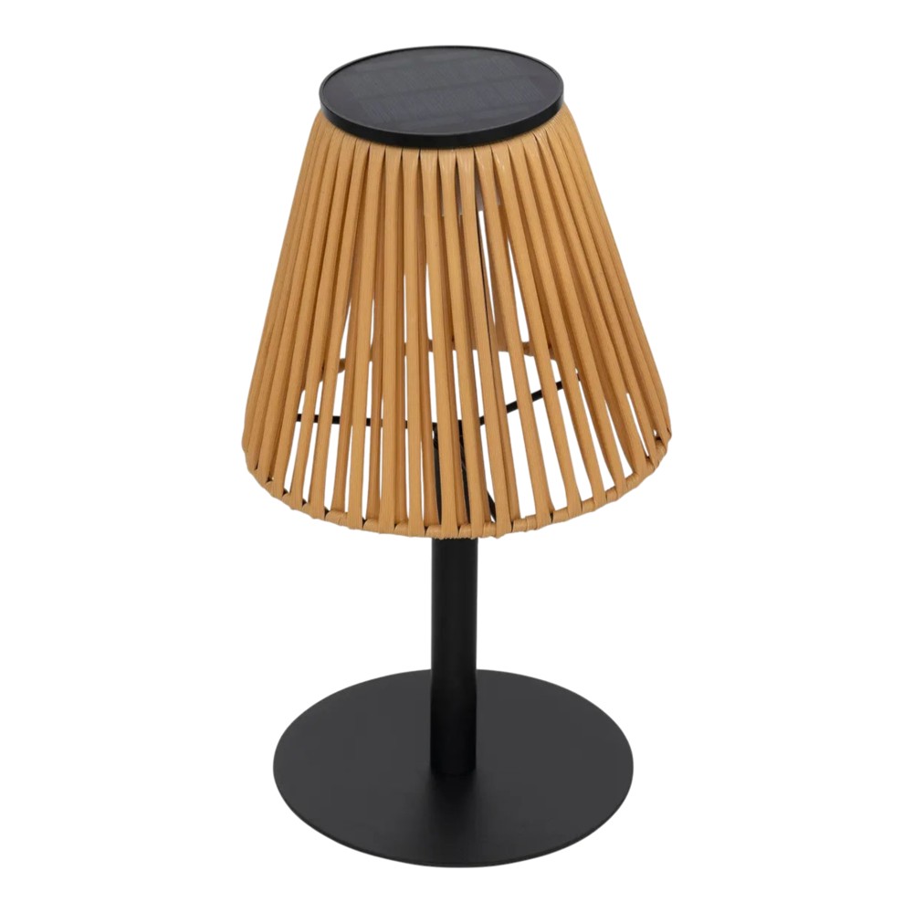 The solar-powered light stands 30 cm tall and is made of metal and resin, giving it an elegant and durable appearance. This light provides warm white lighting and can be charged via the solar panel or USB. With a 6-hour working time after a full charge, it is an excellent choice for both outdoor and indoor use.
