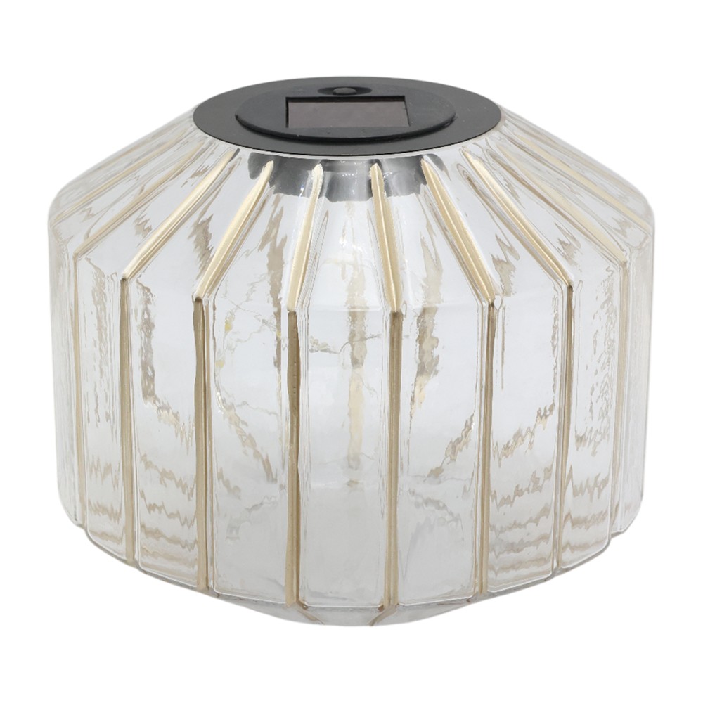 Solar panel table lamp, 18 cm diameter and 15 cm height, made of transparent material. This lamp is ideal for tables and indoor environments, using solar energy to provide soft and ecological lighting, bringing a warm and modern atmosphere to any space.