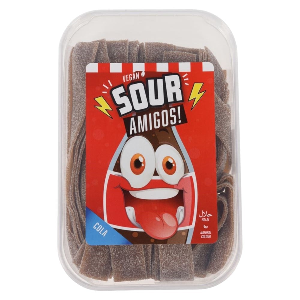 Sour belts with cola flavour. Ingredients: sugar, isoglucose syrup, wheat flour, vegetable fat (palm), acids (E296, E330), wheat starch, concentrated apple juice, humectant (E420), colouring food (barley malt extract), flavouring, emulsifier (E471).