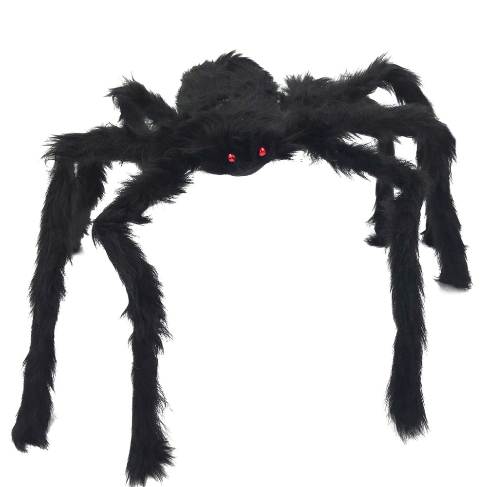 A black artificial spider covered with hair and red eyes. Thanks to the sewn wires, the spider's legs can be bent easily. The spider looks great as a Halloween decoration.