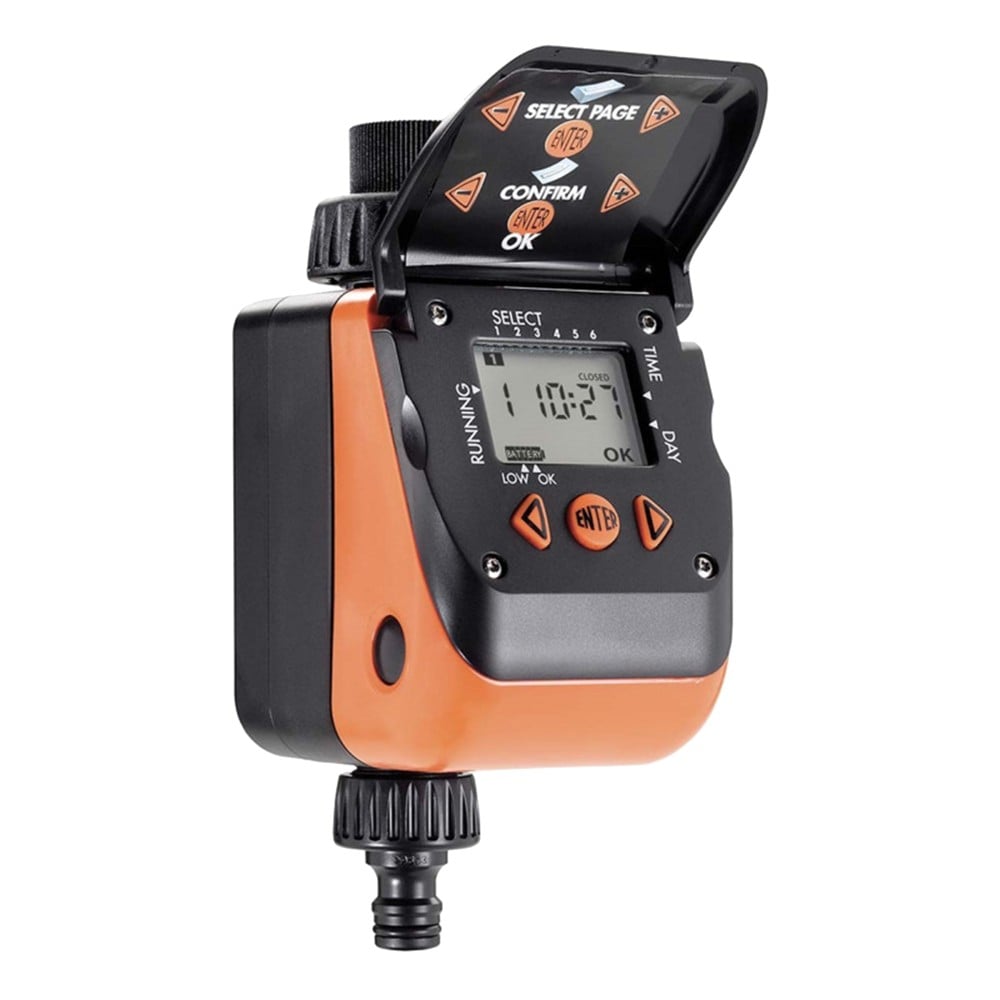 Using this automatic one-line water timer you can set 6 watering cycles a day. Featuring just three buttons for easy programming, the large display clearly communicates to the user all the information required by means of easy-tounderstand symbols and numbers. 6 Water cycle times vary from 1 min to 23 hours and 59 min. Weekly watering cycles may also be programmed with the exception of the days you wish to omit. It is also possible to display the cycles programmed and delete those cycles no longer required. The unit is fitted with a washable stainless steel filter. 3/4” (20-27 mm) tap connector.