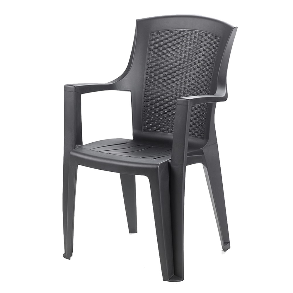 With armrests - Stackable - High-back. Chair anthracite garden with polypropylene structure and back in rattan effect. Suitable for outdoor can be placed in the garden or under the gazebo. Significant to the effect rattan decorations on the back which gives plenty of grace to a simple and functional object. Is not recommend to be used on smooth surfaces.