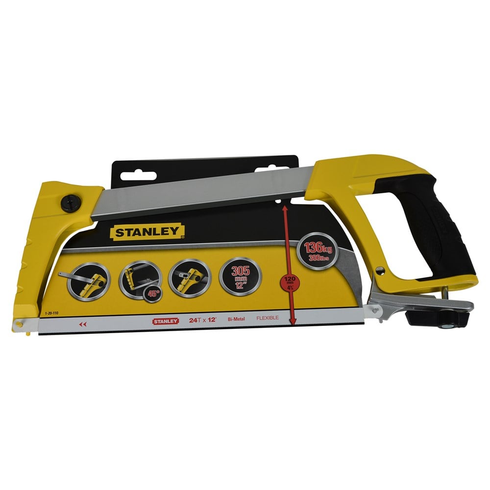 Stanley turbocut hacksaw The Stanley Turbocut Hacksaw design encorporates the improved Dynagrip for both accurate and comfortable sawing. Durable Bi-metal frame designed for extra cutting capacity and to withstand heavy duty use. Patented tensioning device allows adjustment and memory of the tension up to 80kgs.