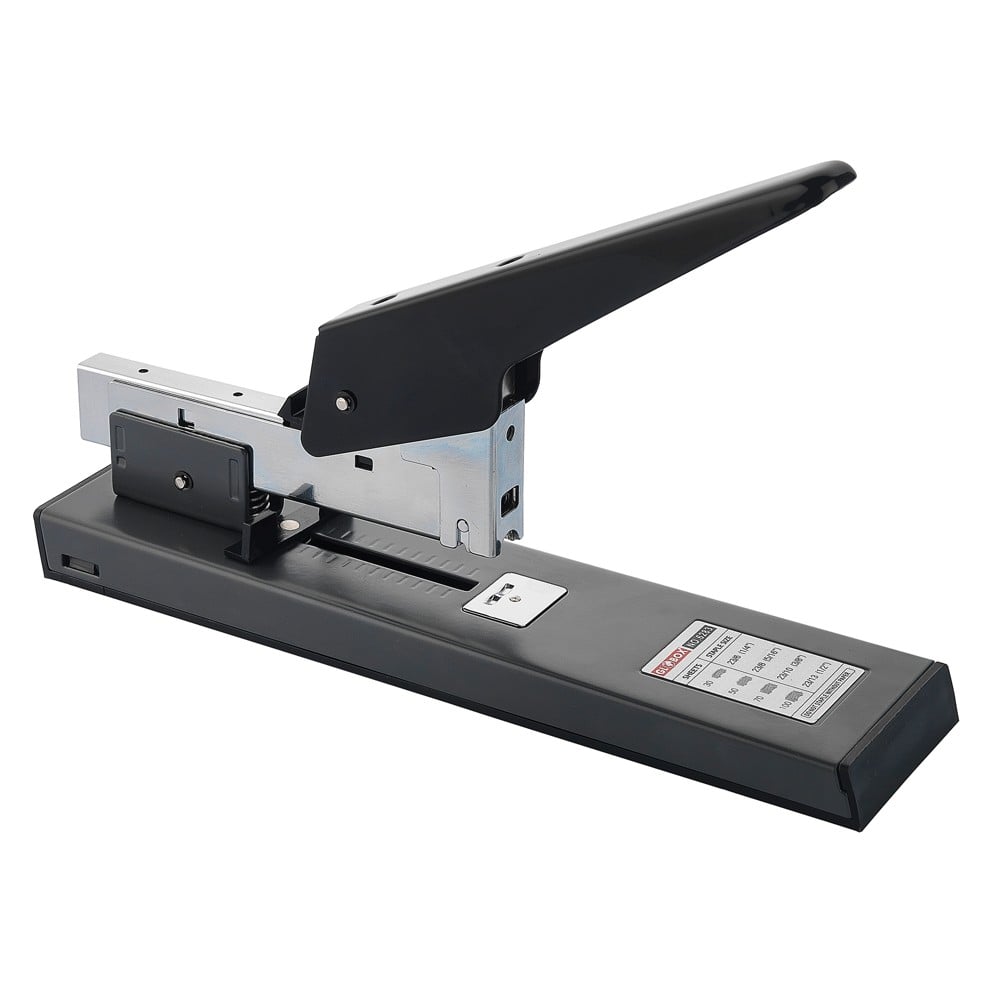 Stapler for paper, made of metal material. The stapler has an ergonomic design, which allows it to adapt to the shape of the hand and be easy to use. It is used to capture various documents in schools, offices, offices, etc., and has a capture capacity of up to 100 sheets.