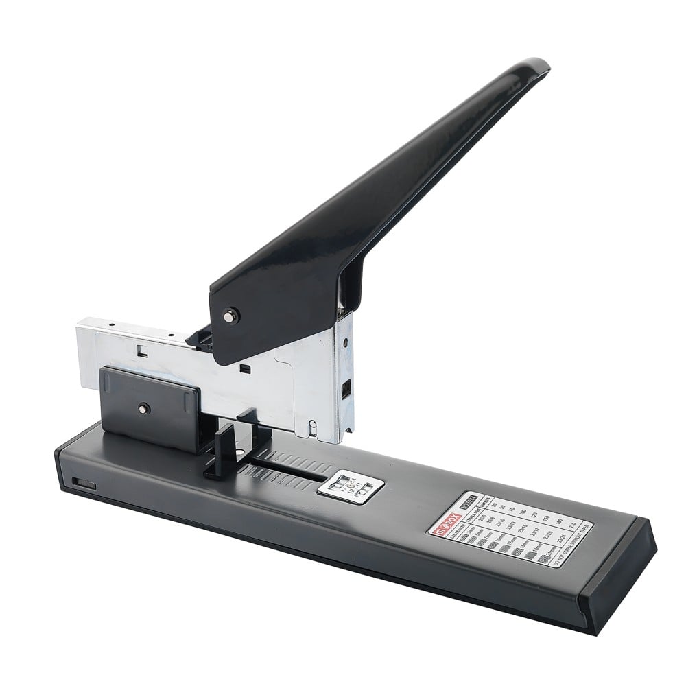 Stapler for paper, made of metal material. The stapler has an ergonomic design, which allows it to adapt to the shape of the hand and be easy to use. It is used to capture various documents in schools, offices, offices, etc., and has a capture capacity of up to 200 sheets.