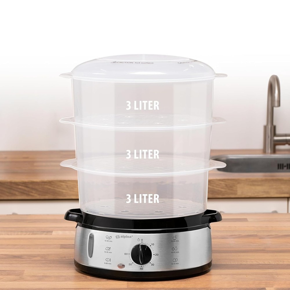 In the alpina food steamer you can steam and prepare different types of vegetables, meat and other foods. The 3 supplied containers can hold a total capacity of 9 liters at a time. This allows you to prepare a complete meal in one go with the steamer. The steamer even comes with a separate container in which you can prepare rice. The preparation times of different foods in the steamer are: