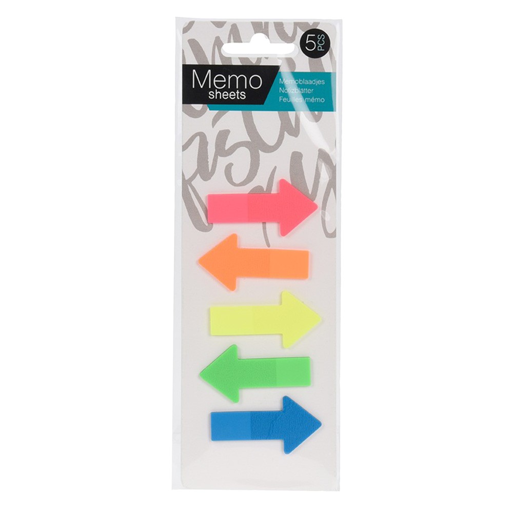 Sticky memo sheets for writing notes, made of durable paper material, in different neon colors. The memo sheets are used for placing small notes on the surfaces of desks, computers, and for leaving memo notes inside the pages of books or notebooks.