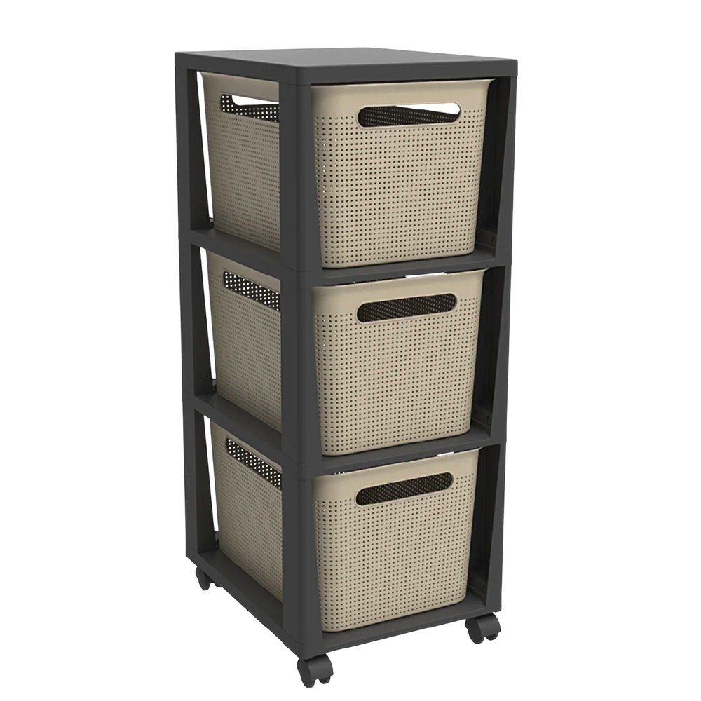 Storage rack with wheels "Brisen" in plastic color cappucino, black, Capacity 3 x 16 l, Dimensions : H 77 cm x L 36.6 cm x P 29.6 cm