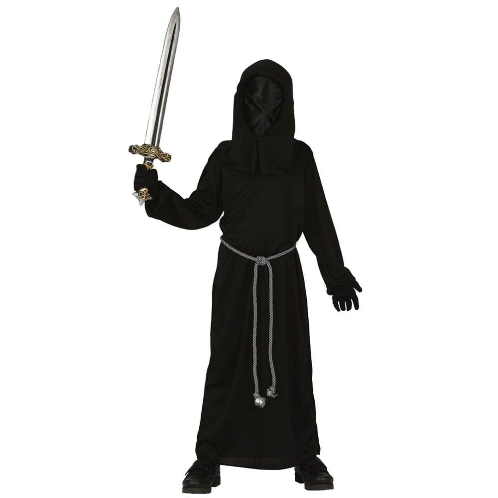 Children's suit made of polyester material, in black color. It is suitable for children aged 7-9 years. The package includes the black hooded cape and waist belt.
