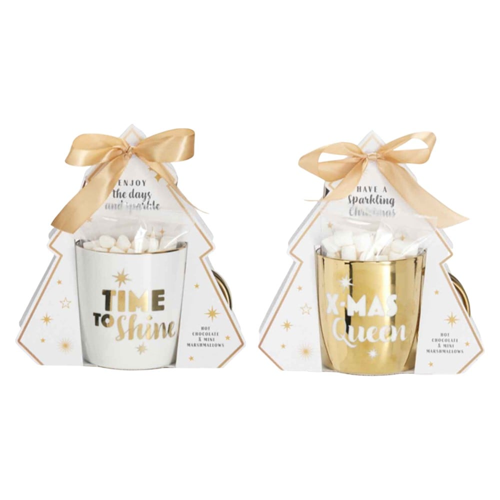 Powdered drinking chocolate with vanilla flavour. Ingredients: sugar, fatreduced cocoa powder, whey powder [milk], skimmed milk powder, flavouring, emulsifier (E322); Cocoa solids: 25% minimum. Mini marshmallows. Ingredients: sugar, corn syrup, water, dextrose, beef gelatine, maize starch, natural flavourings. May contain: cereals containing gluten (wheat), milk.