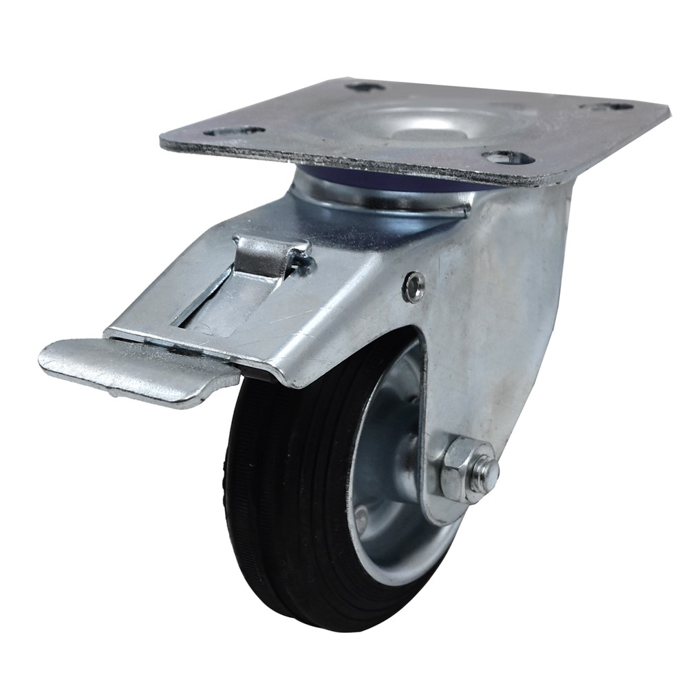 The wheels in this series are suitable for use on all kinds of service equipment. with 360° round, with brake, metal plate easy to fix, Double ball bearing swivel head, dust protection, Pressed sheet steel rim, rubber with polyamide bush, Electro galvanized against corrosion -20°C to + 60°C