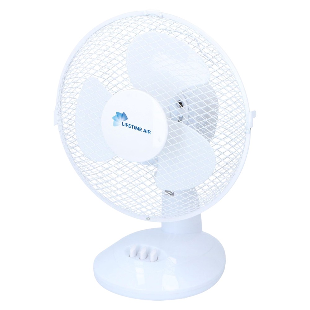 During warm days and nights, fans provide wonderful cooling with a nice breeze. This white fan from Lifetime Air can be placed on a table, desk or cupboard and it will blow you cooling air. The table fan has a diameter of 23 centimetres. You can set the fan in various ways. For example, you can choose from 2 speeds and you can tilt it to determine the blowing direction. The fan can also oscillate, after which it swings from left to right and distributes the air even better through the room. You can switch this swinging on or off via the button on the device. The 3 blades are well protected behind a mesh grille. Diameter: 23cm. Height: 38cm. 2 speeds.