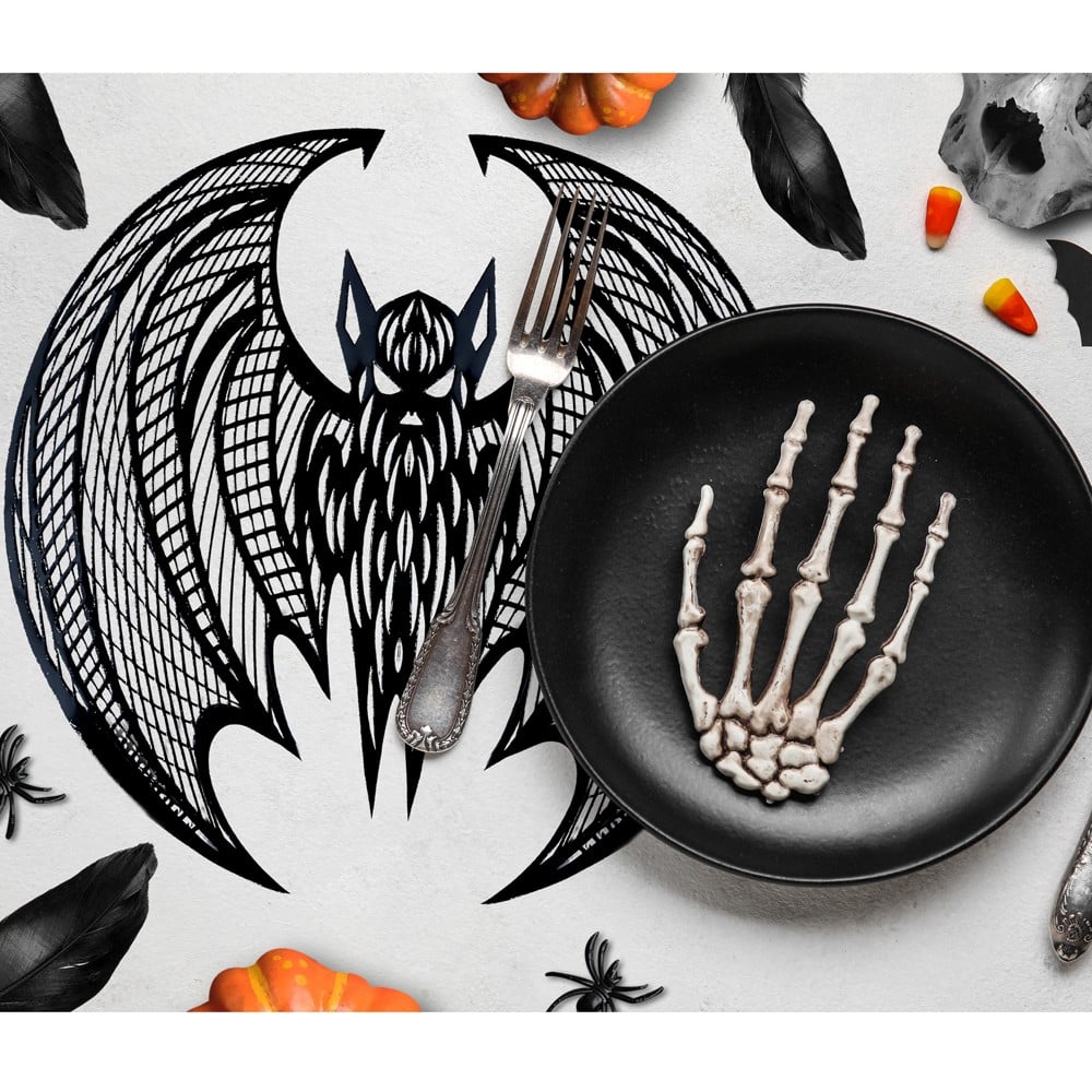 If you're hosting a Halloween party, this bat-themed placemat will make the table decor even more special. It is made of black PVC material and has a size of 38 cm.