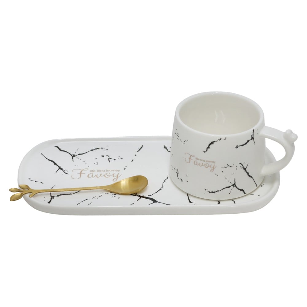 Tea cup with serving plate made of ceramics in white. The cup has 7.5xh6 cm dimensions, while the plate 23.5x11 cm. This set brings a clean and refined atmosphere for tea service.
