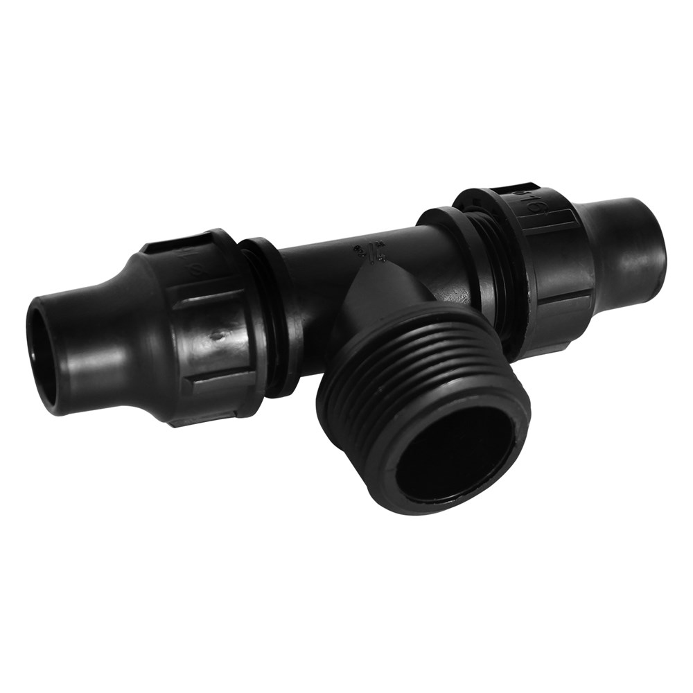Tee with faucet of PE 16x1"x16 mm male with angle 90°. Used to installations angular water supply infrastructure lines, in irrigation and agricul, etc. This tee enables network branching 90° angle. This tee connect LDPE pipe Ø 16 with other fittings by fillet, for joining the fillet recommend tu use teflon whiles pipe connect whith tee in mechanically with faucet. Manufactured with European standards, resistant to corrosive materials designed to withstand pressure up to 6 Bar.