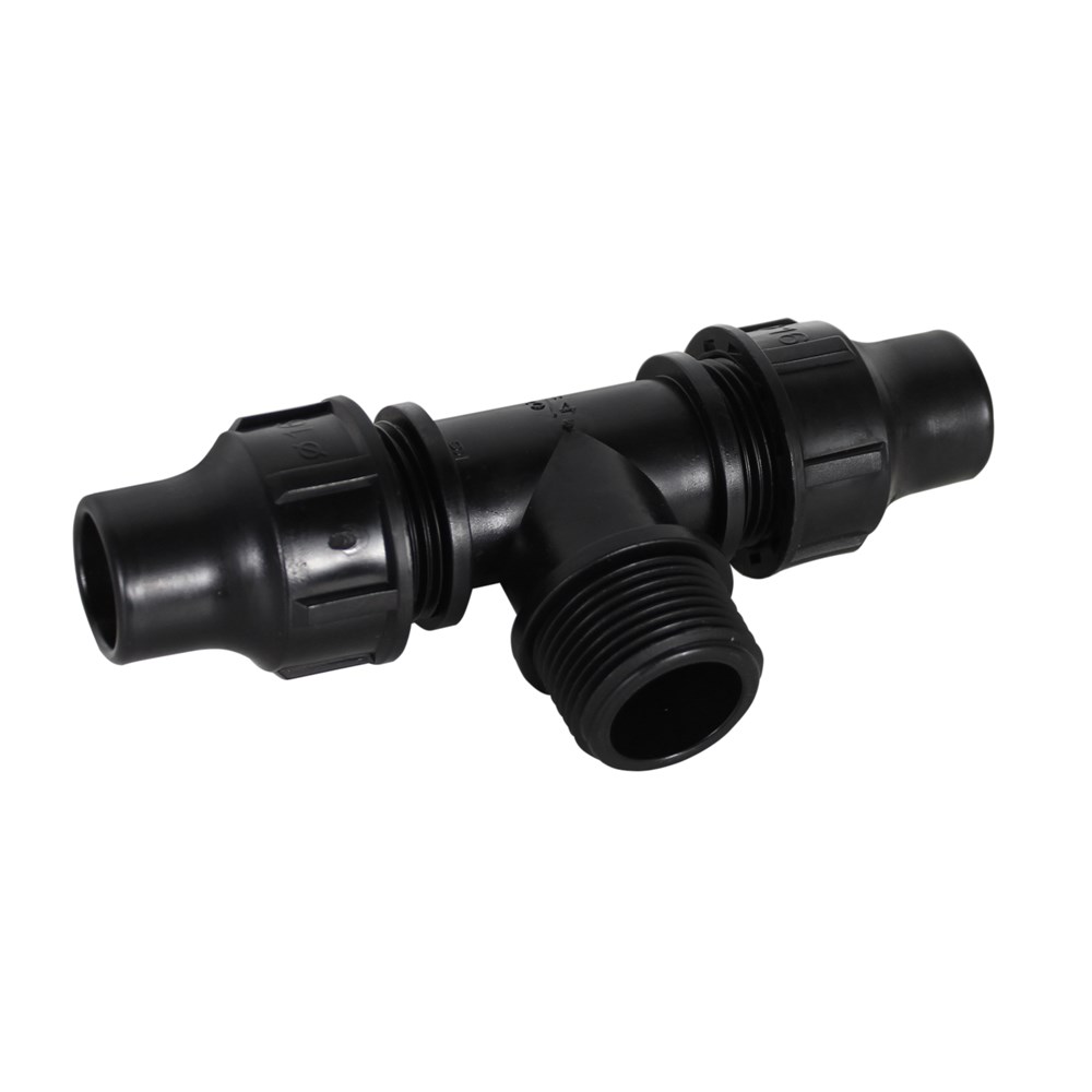Tee with faucet of PE 16x3/4"x16 mm male with angle 90°. Used to installations angular water supply infrastructure lines, in irrigation and agricul, etc. This tee enables network branching 90° angle. This tee connect LDPE pipe Ø 16 with other fittings by fillet, for joining the fillet recommend tu use teflon whiles pipe connect whith tee in mechanically with faucet. Manufactured with European standards, resistant to corrosive materials designed to withstand pressure up to 6 Bar.
