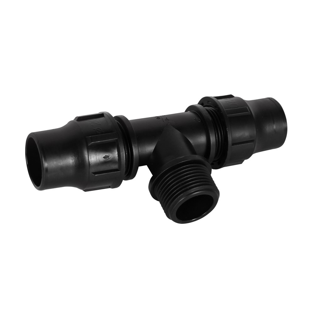 Tee with faucet of PE 20x3/4"x20 mm male with angle 90°. Used to installations angular water supply infrastructure lines, in irrigation and agricul, etc. This tee enables network branching 90° angle. This tee connect LDPE pipe Ø 20 with other fittings by fillet, for joining the fillet recommend tu use teflon whiles pipe connect whith tee in mechanically with faucet. Manufactured with European standards, resistant to corrosive materials designed to withstand pressure up to 6 Bar.
