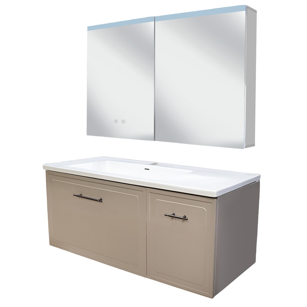 The "Isto" bathroom furniture set brings a classic look with highly functional equipment. Consisting of a furniture with two cupboards in PVC, a porcelain basin and a mirror with LED lighting and handles. The beige and PVC furniture is mounted on the wall, giving it a modern but also practical appearance with ease of cleaning. The PVC material is impervious to water making this furniture ideal for humid environments such as toilets. The porcelain sink is placed on top of the furniture and has a large sink as well as space for placing personal items. The mirror with LED lighting is equipped with the function of turning on and off by touch as well as the innovative function of drying the glass, preventing the accumulation of vapors when you take a shower. Also, this mirror is equipped with drawers for storage and quick access. Furniture dimensions: height 51 cm x width 120 cm x depth 50 cm. Basin dimensions : width 120 cm x depth 50 cm. Mirror dimensions: height 70 cm x width 110 cm x depth 14 cm.