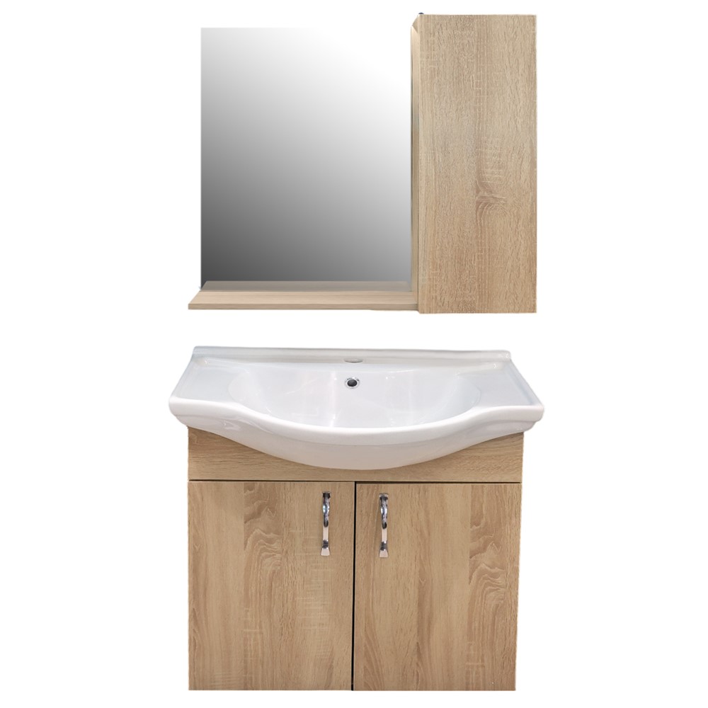 The "SQUARE 80" toilet furniture set, wall mounted, walnut wood color presents the elegant model that enlivens your toilet. The white porcelain sink offers style in the decor of your toilet, ease of cleaning, providing a beautiful and very modern look for toilets with medium spaces. MDF furniture material is moisture resistant. The white color is very well composed in rooms with modern monochrome tiles and motifs of different colors. The set includes the sink, the cabinet below it and the mirror, all packaged for a very simple and quick assembly by anyone.