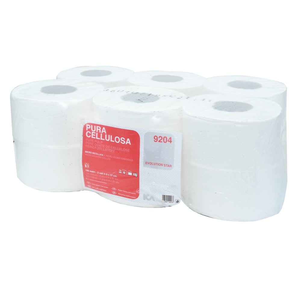 Jumbo Mini Roll, 100% Cellulose, Pure Pulp is a clean, wood-based, renewable and biodegradable, 2-sheet raw material, pure, micro-embossed pulp puree.